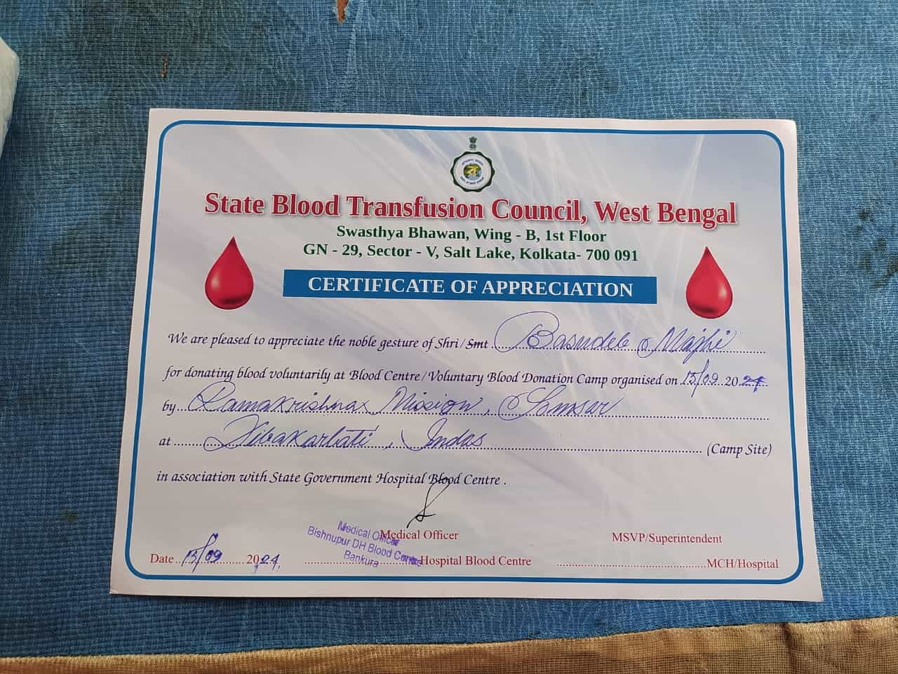 Blood Donation Camp at Rkm Indas the Sub centre of Ramakrishna mission,Somsar 15.09.2024